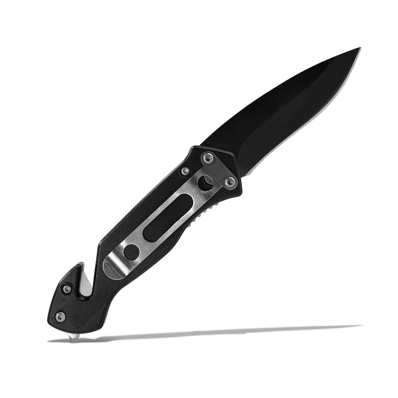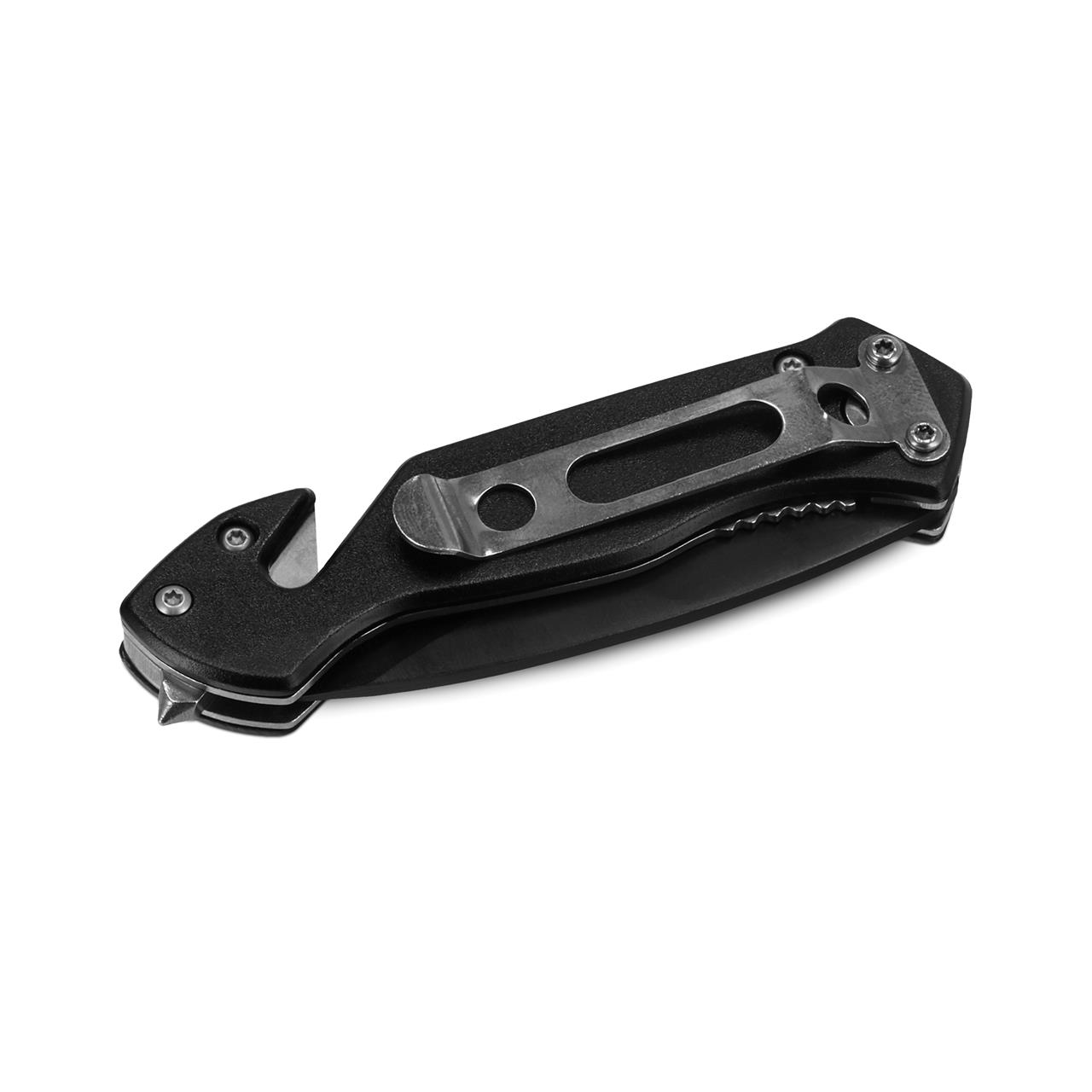 Kompaktes Taschenmesser im Aluminiumgehäuse mit Gurtcutter und Nothammer. Qualitätsstahlklinge.