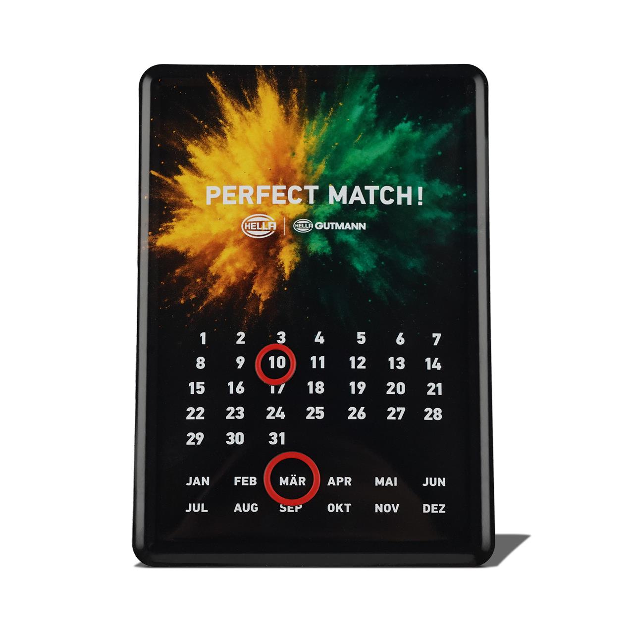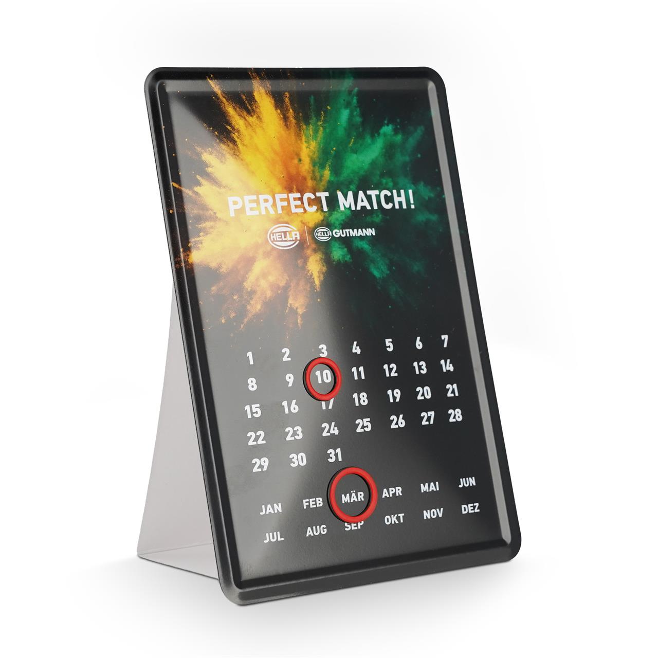 Schutzlackversiegelt, Rückseite mit Pappaufsteller, zwei Ringmagnete auf der Vorderseite für das Kalendarium ,